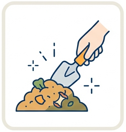 穴を掘って、生ごみを土と混ぜ合わせるだけ。毎日のほんの少しの手間で、驚くほどキッチンがスッキリします。忙しい日常の中でも「気ままに」続けられる、一番シンプルなエコ習慣です。