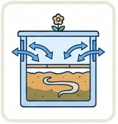 土の中に生息する「好気性微生物」が有機物を分解し、水と二酸化炭素へと還元。透明な蓋から降り注ぐ太陽光が土の温度を上げ、微生物の分解活動を劇的に活性化させます。