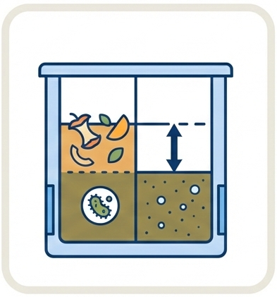 最後に乾いた土でしっかり蓋をすることで、嫌な臭いをシャットアウトします。さらにサイドの隙間から常に新鮮な空気が入れ替わるため、生ごみが腐らず、住宅街のお庭やベランダでも安心して設置できます。