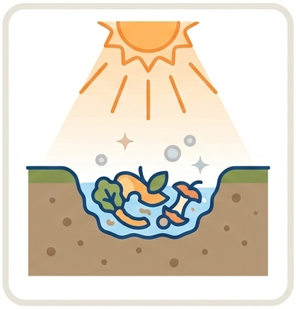 太陽の熱と適切な水分量により、微生物が活発に生ごみを分解し始めます。